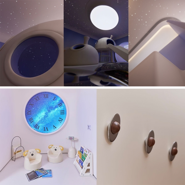 围绕“太空旅程”主题,母婴室内,惊喜细节俯拾皆是。从星空顶、“太空舷窗”、还有飞行器造型的儿童滑梯,甚至飞碟形状的挂衣钩,这个空间,不止是一个应急之所,更是惊喜的去处。