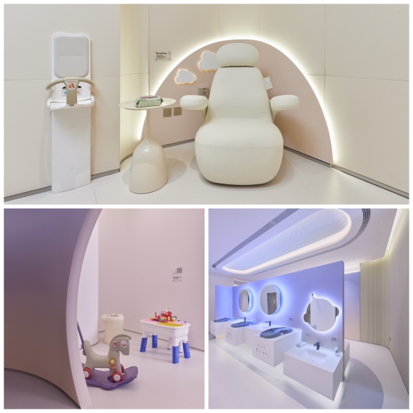 步入郑州机场母婴室内,妈妈们的第一感受是被宁静和放松包裹。洁净的白、柔和的光,在低明度和低饱和度色彩下,新母婴室的氛围温和恬静,空间分区逐步从开放过渡到私密,让妈妈们更安心放松,也能让爸爸在内的家庭成员们参与喂食、换尿布,实现真正的“全员育儿”。