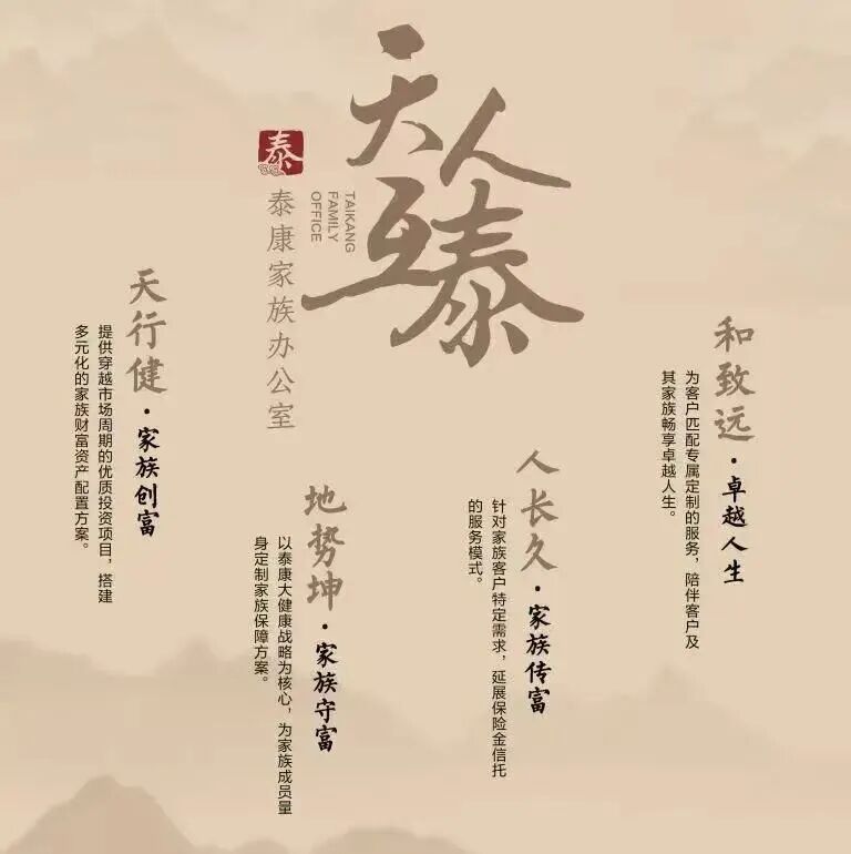 未来,泰康家办将不忘初心,继续秉持“守正出新,行稳致远”的理念,以“天地人和,泰然美好”为愿景,持续深化“支付+服务+投资”生态融合,优化服务体系,成为中高净值家族财富传承与美好生活的坚实伙伴,助力家族实现健康无忧、财富永续、家族兴旺。