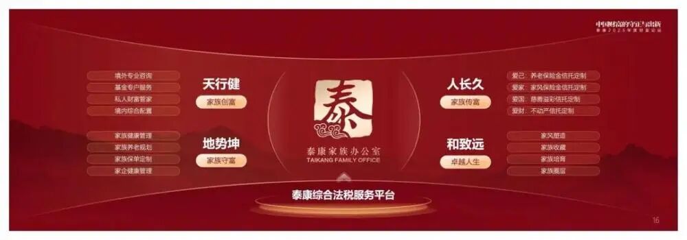 日前,“中国财富的守正与出新”泰康2025年度财富论坛举办,在泰康30周年之际,焕新发布泰康家族办公室客户服务体系,聚焦“天行健、地势坤、人长久、和致远”核心理念,融合泰康“支付+服务+投资”新寿险生态,依托“幸福有约”产品服务体系,为中高净值家族提供全生命周期服务,助力实现健康无忧、财富永续与家族兴旺的美好愿景。