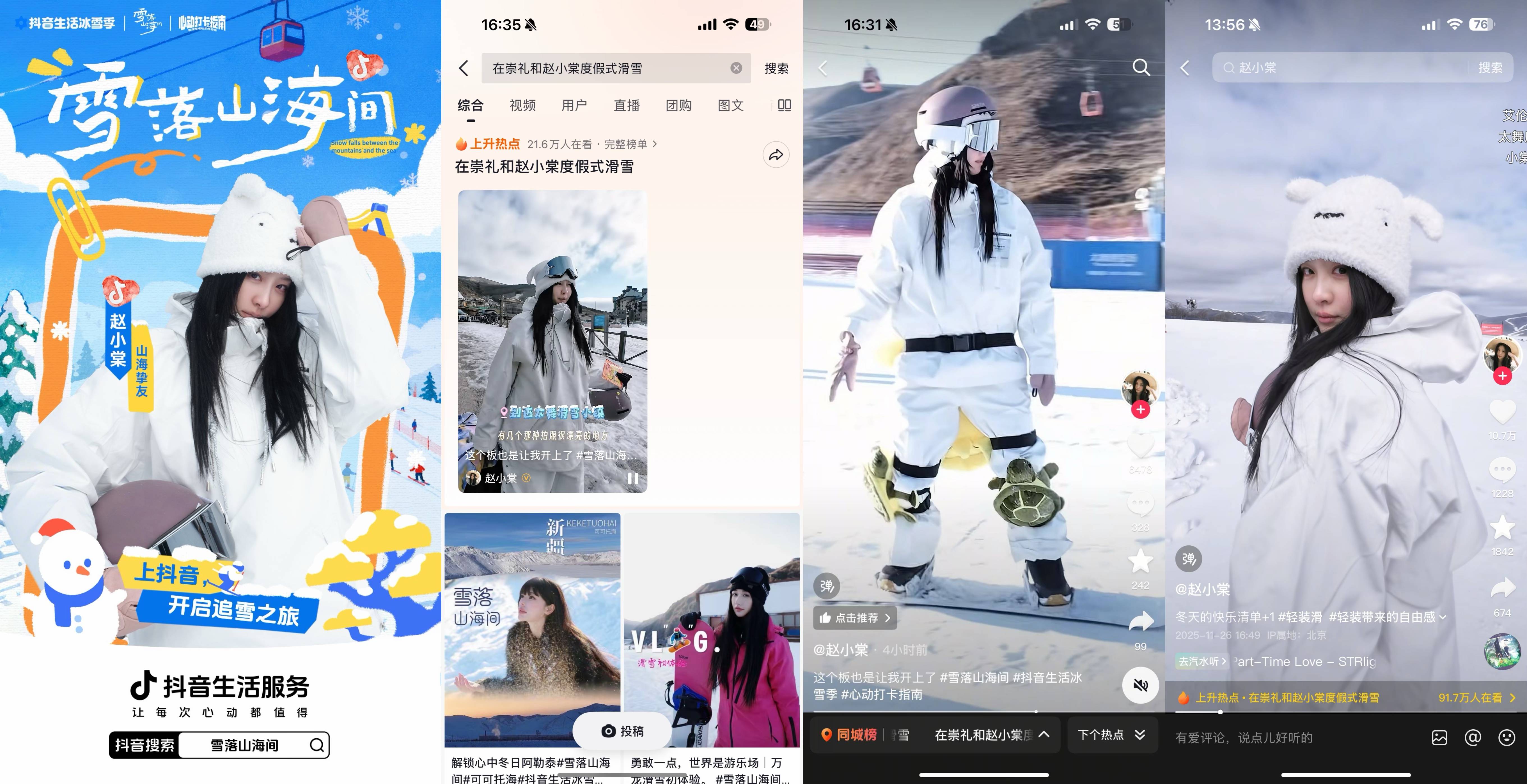 此外,赵小棠分享崇礼度假Vlog,以沉浸式视角演绎了冬日“滑雪+度假”的品质玩法,相关话题#在崇礼和赵小棠度假式滑雪 登同城榜TOP1,成功将“崇礼”这一目的地与沉浸式、高品质的冬季旅行体验深度绑定,为当地酒店、雪场等消费场景的持续转化注入了内容吸引力。