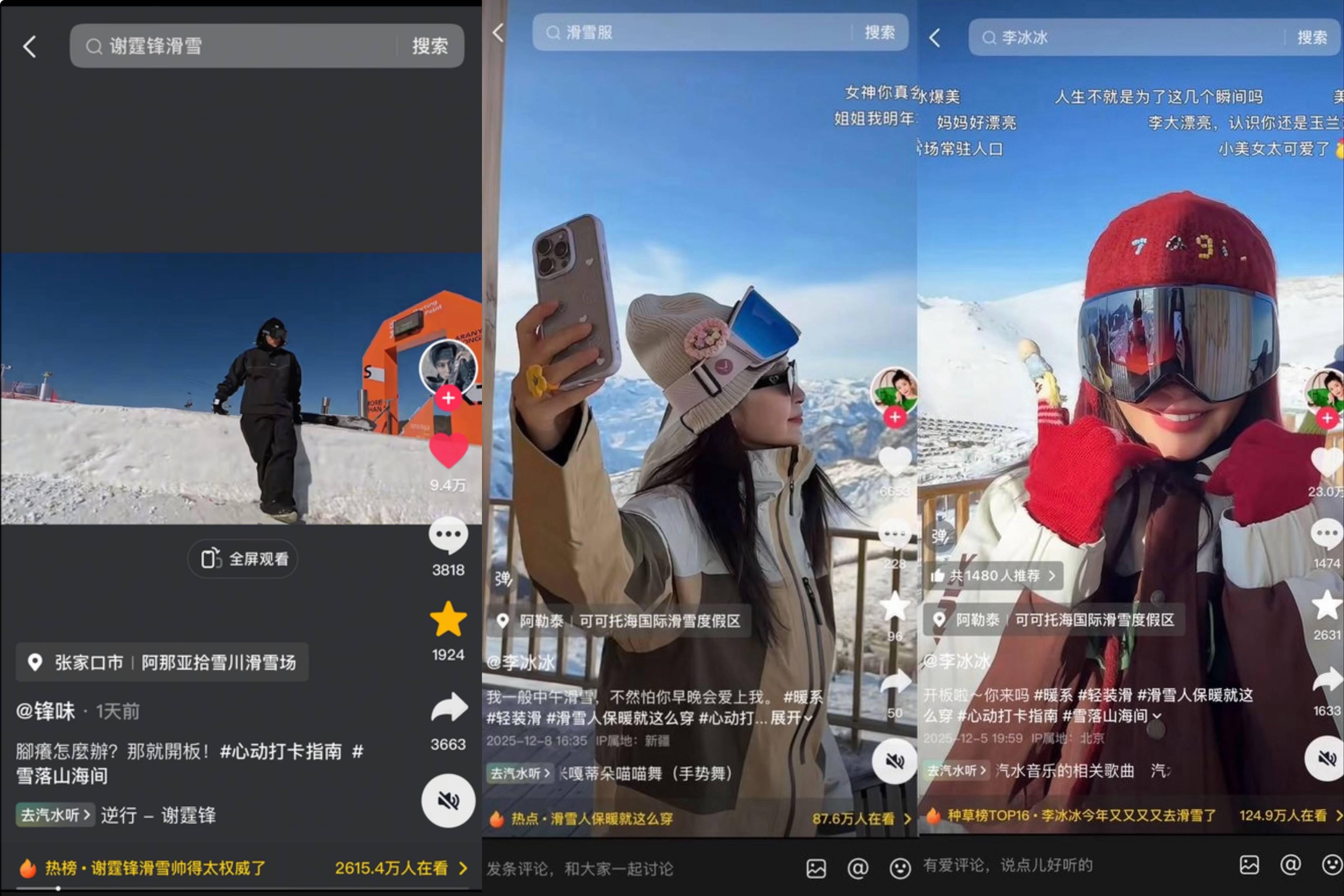 与此同时,谢霆锋、李冰冰等艺人的专业滑雪内容,实现了对核心爱好者及泛人群的精准穿透与引流。谢霆锋的滑雪视频发布当日播放量即破196万,带动#谢霆锋滑雪帅得太权威了 登上抖音娱乐榜TOP4、全国热榜TOP22,更为视频挂载的「阿那亚拾雪川滑雪场」带来了单日超4100次的详情页曝光,商家搜索量环比激增285%。李冰冰的滑雪视频播放量突破300万,点赞互动达35w+,#李冰冰今年又又又去滑雪了 最高登上种草榜Top4,直接带动其关联的“可可托海滑雪场”搜索指数同比飙升61.28%,实现了从内容种草到线下消费的高效转化。