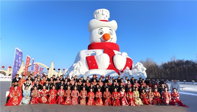 一场专属冰雪浪漫之旅徐徐展开。新人们乘坐120米高的大雪花摩天轮,登高俯瞰银装素裹的北国风光,将冰城美景尽收眼底;在太阳岛雪博会,他们驻足于憨态可掬的“雪人先生”、气势磅礴的主塑“雪艳春”等雪雕作品前拍照留念,沉浸式体验“走着走着就一起白头”的人工降雪浪漫场景;在百年中央大街,他们手捧喜糖,与来自全球的游客分享新婚喜悦,让幸福气息弥漫在街头巷尾,成为冬日里最动人的风景。