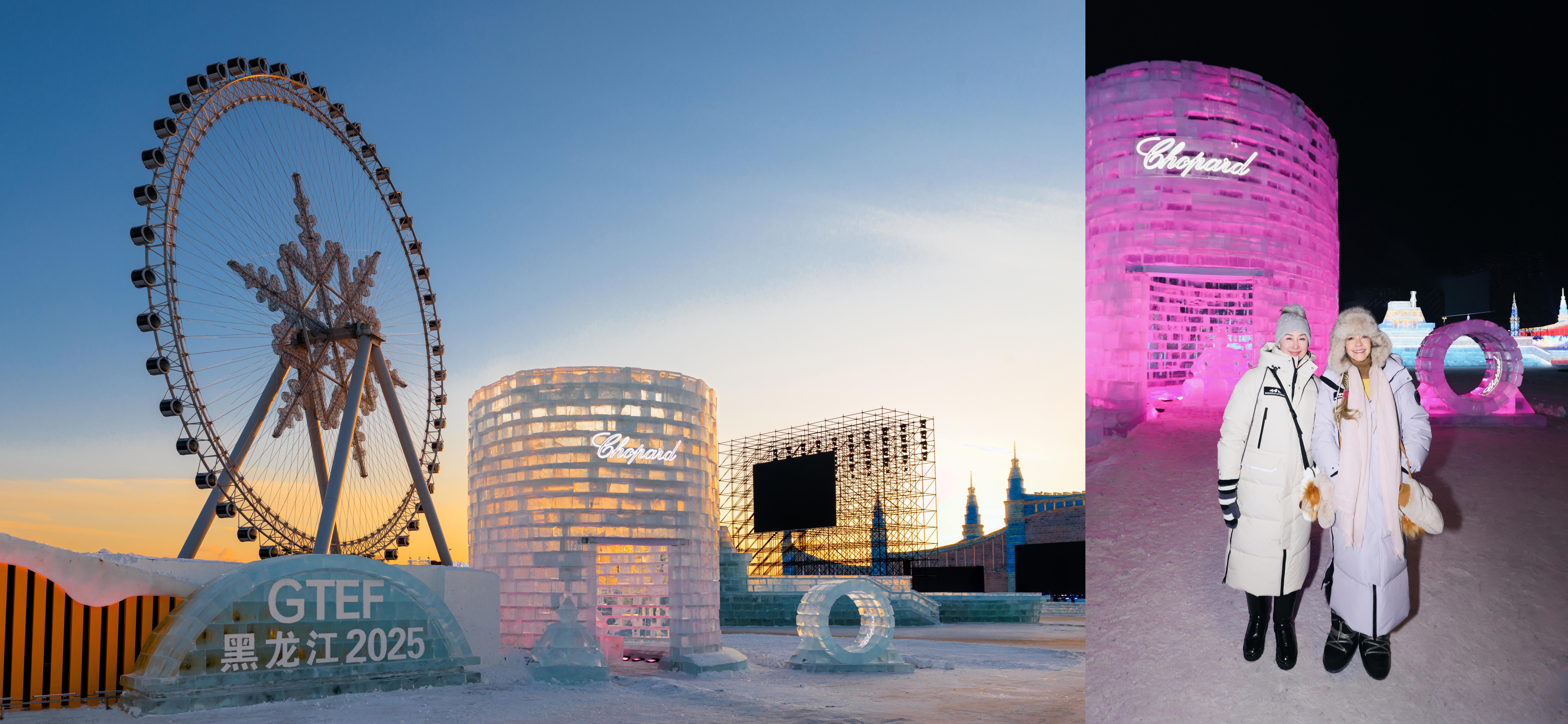 Chopard萧邦联合总裁兼艺术总监卡罗琳·舍费尔(Caroline Scheufele)与世界旅游经济论坛副主席兼秘书长何超琼亮相哈尔滨“冰雪大世界”