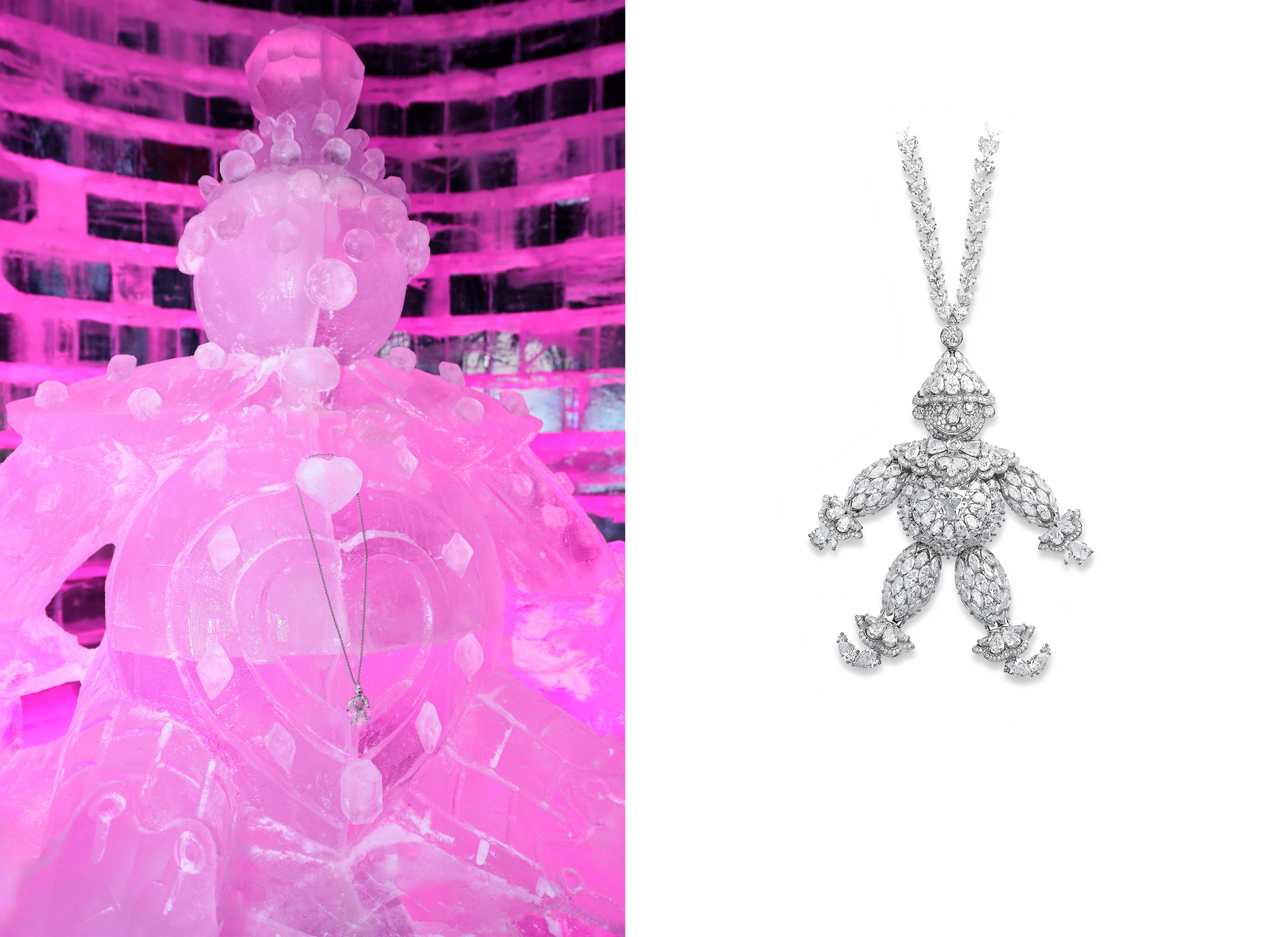 冰雕入口处,以Chopard萧邦经典的Happy Clown系列为灵感打造的“小丑”冰雕置身梦幻景致之间。作为Chopard萧邦联合总裁兼艺术总监卡罗琳·舍费尔(Caroline Scheufele)创作的首件珠宝及品牌珠宝的开山之作,这一承载其无尽创意的经典符号,如今于皑皑冰雪中焕发新生,以灵动姿态传递着悦然无拘的“乐享生活”理念。步入冰雕之内,另一尊“小丑”冰雕于光影深处温暖相迎,其胸前勾勒精致爱心轮廓,以妙然童趣点亮冬日愉悦光景与新年希冀。