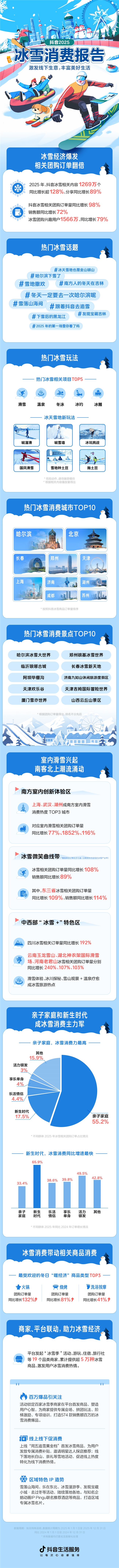 2025年11月起,抖音生活服务发起“冰雪季”活动,联合游玩、住宿、旅行社等19个品类商家,累计提供超5万种冰雪商品,通过百万爆品、线上线下促销、区域特色IP打造,激发各地冰雪消费热情。抖音生活服务“冰雪季”活动相关负责人介绍,活动不仅上线百万爆品,也为用户发放专属消费补贴。平台将持续通过内容种草、达人探店、特色IP联名,助力线下冰雪消费。