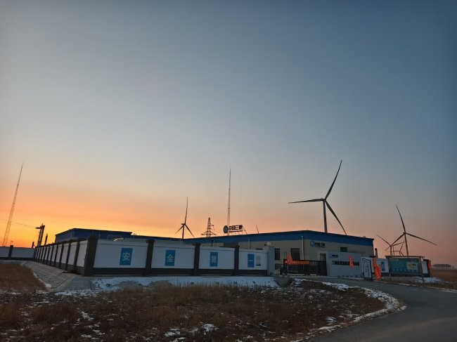 傍晚,零下二十三度的寒风掠过农安县的旷野。夕阳余晖将南洼子风电场的白色围墙染成暖金色,墙面上“安全第一”的蓝色大字在暮色中格外醒目。远处,几座巨大的白色风机矗立在枯黄的草甸间,地面残雪斑驳,记录着寒潮过境的痕迹。