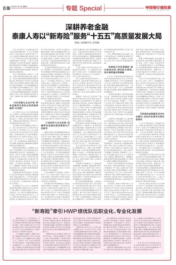 2026年是“十五五”开局之年,泰康人寿党委根据做好“金融五篇大文章”的要求,结合公司在长寿时代推进“新寿险”的创新实践,开展理论学习,日前,《中国银行保险报》刊登泰康人寿党委书记薛继豪署名文章《深耕养老金融 ,泰康人寿以“新寿险”服务“十五五”高质量发展大局》。